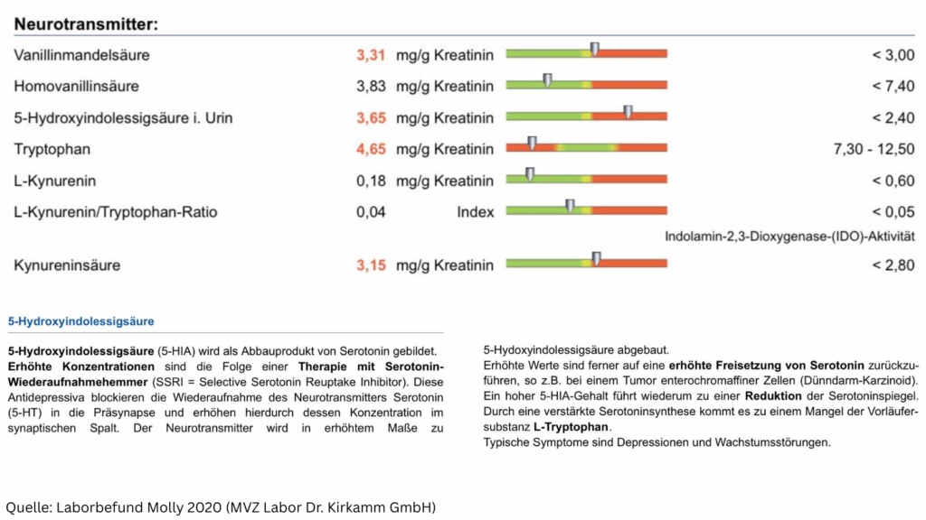 Aus eigener Erfahrung: Diese Zusammenhänge kenne ich auch aus meiner eigenen Krankengeschichte. Bei mir wurden die Neurotransmitter über Jahre hinweg von meiner funktionellen Medizinerin untersucht und gezielt versucht zu beeinflussen. Denn bei der ersten Messung 2020 fiel auf, dass mein 5-Hydroxyindolessigsäure-Wert (5-HIAA) – das Abbauprodukt von Serotonin – mit 3,65 mg/g Kreatinin deutlich über dem Normbereich lag (Referenz: <2,40). Da ich keine SSRI-Medikamente einnahm, stellte sich die beunruhigende Frage: Könnte das an einem Dünndarmkarzinoid liegen? Zum Glück konnte diese Verdachtsdiagnose ausgeschlossen werden. Dennoch zeigt es, wie komplex der Serotoninstoffwechsel bei ME/CFS sein kann – und wie wichtig eine sorgfältige Diagnostik ist.
