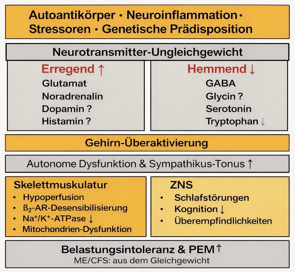Das Gehirn ist ein empfindliches Orchester chemischer Botenstoffe. Bei ME und Long COVID scheint dieses Orchester aus dem Takt geraten zu sein: Aktivierende Neurotransmitter dominieren, während beruhigende in den Hintergrund treten. Dieses Ungleichgewicht könnte viele der quälenden Symptome erklären – von Schlafstörungen über kognitive Probleme bis hin zu Muskelschwäche.