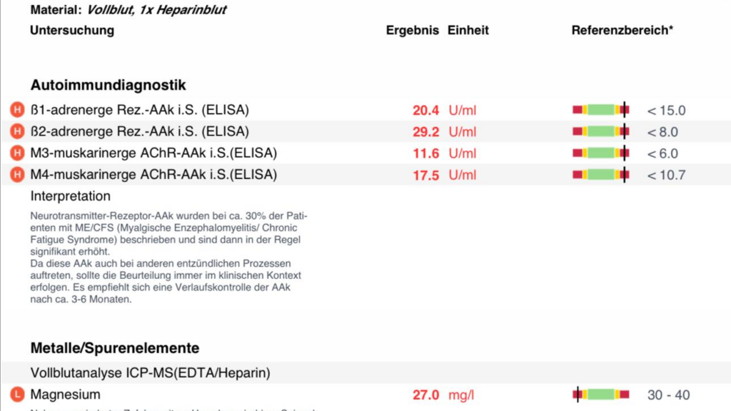 Aus eigener Erfahrung: Diese Autoantikörper-Problematik ist auch bei mir messbar. In meinen Befunden von 2022 und 2024 wurden erhöhte Antikörper gegen β1- und β2-adrenerge Rezeptoren sowie gegen M3- und M4-muskarinerge Acetylcholin-Rezeptoren nachgewiesen – also genau gegen jene Rezeptoren, die für Noradrenalin und Acetylcholin zuständig sind. Die Werte lagen teilweise deutlich über den Normgrenzen (z.B. β1-AAk: 49,1 U/ml bei Referenz <15,0 im Jahr 2024). Das Labor merkte an, dass solche Autoantikörper bei etwa 30% der ME/CFS-Patienten gefunden werden und in der Regel signifikant erhöht sind. Bei mir wurden sie über die Jahre beobachtet und durch verschiedene Maßnahmen zu beeinflussen versucht.